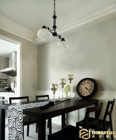 裝飾簡單化,不累贅的空間感餐桌華美的布藝裝飾也是田園風裝飾必備的單品,設計師選擇花紋簡單,色調不突兀。通過吊頂的方式實現功能區劃分。