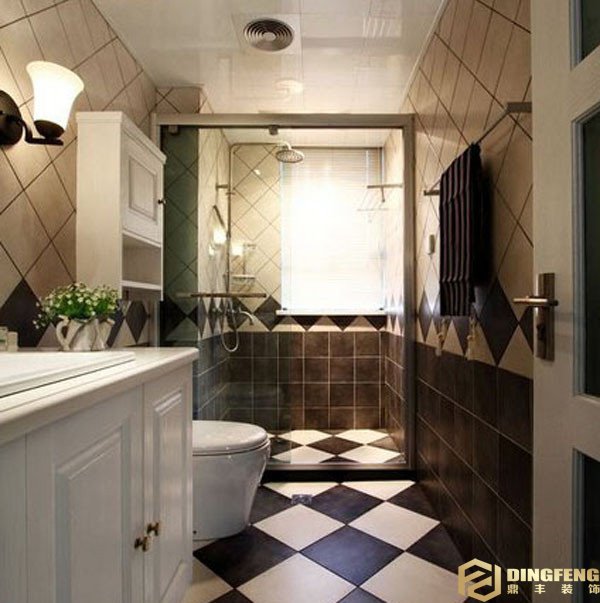 劃分干濕區域安裝淋浴房,做出空間干濕分離。地面和墻體的瓷磚鋪貼選擇既跳躍又協調的拼花方式,色調也以黑白黃為主。洗手柜提供了收納空間。