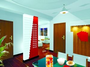 白色方塊的點綴讓紅白搭配的隔斷墻充滿趣味。木格子與磨砂玻璃的組合集傳統(tǒng)與現(xiàn)代為一體。在餐廳與客廳中間,采用木格子與磨砂玻璃的隔斷把二者分開,形成單獨的空間,但玻璃的結合又讓整個空間通而不透,視覺效果得到了保證,看上去十分輕巧秀麗,靜謐感和工藝性盡顯其中。使用技巧:在家居裝飾中,運用橫豎交叉的直線或曲線形成的“格子”裝飾,會給人典雅的感覺,特別是木格子與工藝玻璃、裝飾布等材料聯(lián)合應用時,讓家里既簡單又有個性。