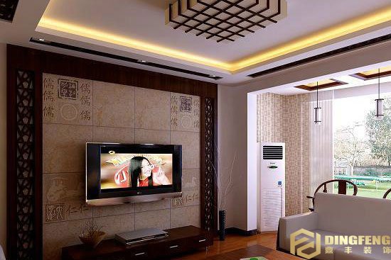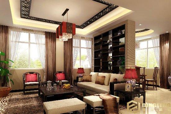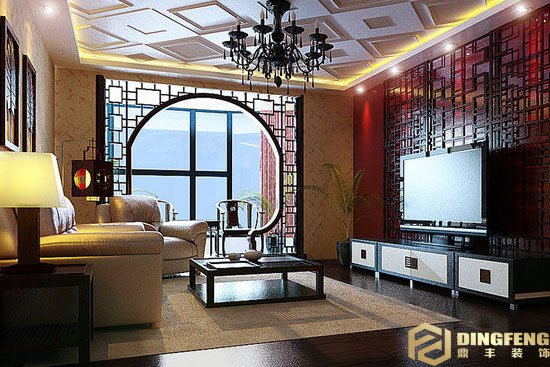 吊頂采用了菱形的設計方式,這樣就跟整個客廳的中式風格緊密地聯系在了一起。配上電視墻大面積的紅色,使得整個客廳具有了中式的現代感來。