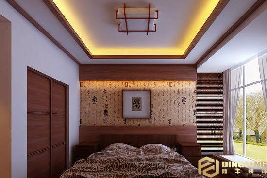 這個臥室以文字為背景,就讓人深刻地感受到了主人的文人氣息。配合上簡約的中式吊頂設計,使得整個臥室的文化氣息更加濃厚。
