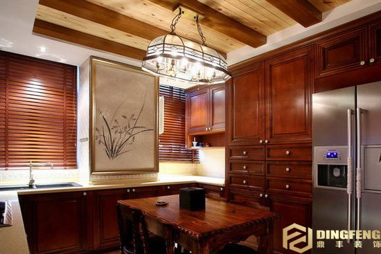 整個廚房是不是很有一種古色古香的感覺呢?吊頂采用橫梁的中式設計方式,讓你仿佛置身于一個有一定歷史的廚房中。古典氣息的吊燈,讓整個廚房更加溫馨。