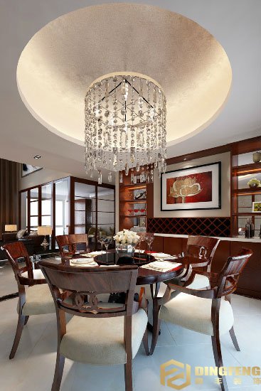 圓形的水晶吊頂設計,就跟圓形的餐桌配合在一起,給人一種象征團圓的意味。這樣的設計是不是很有中國的特色呢?