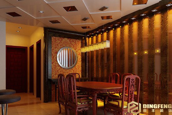 這個中式的吊頂跟一般的中式吊頂具有很明顯的區別。方形吊燈的設計,配上烤漆黑色的吊頂,讓整個餐廳呈現出一種不一樣的中式魅力來。