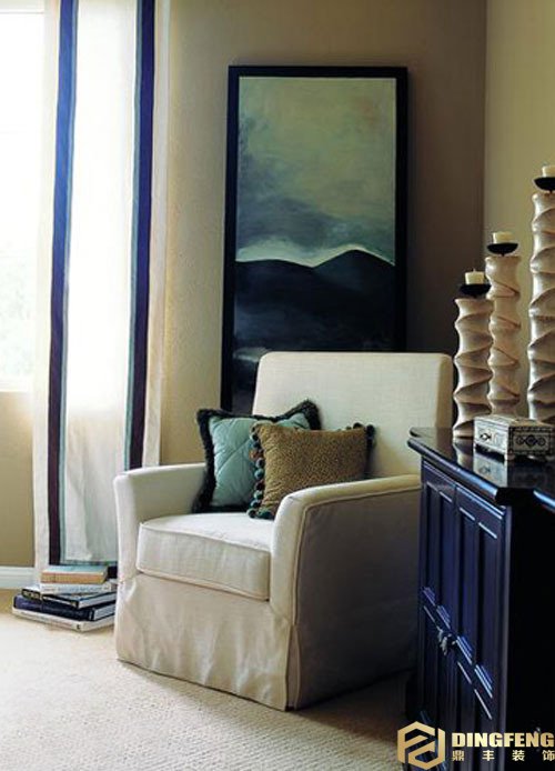 藍色與白色的配飾本是夏天的選擇,搭配厚重感的家具和并以織物烘托氛圍,傳達出秋冬季節的溫暖氣息,而這些飾物的風格應是相近的。